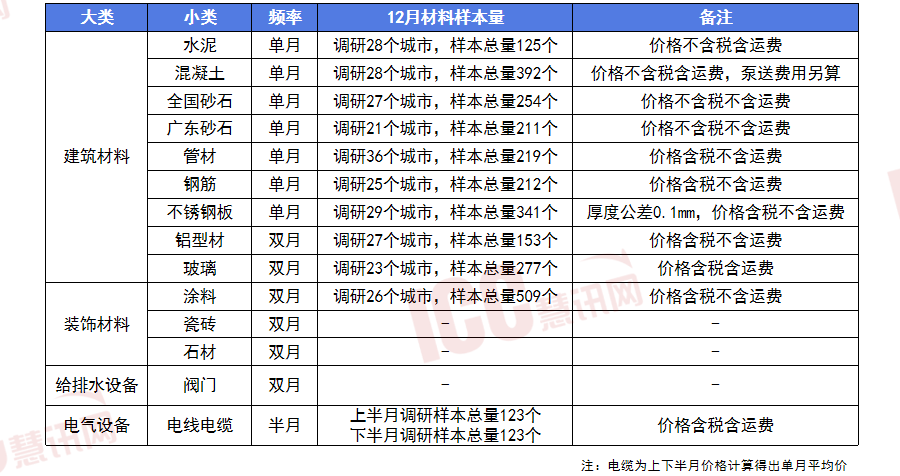 目前囊括13种常见材料价钱,总体呈现“供需双弱、成本下行”款式,
