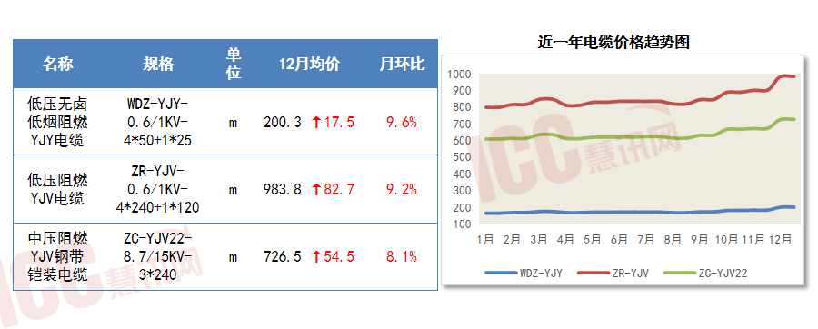 岁暮价钱较岁首年月均有分歧程度抬升。WDZ-YJY、ZR-YJV、ZC-YJV22同比涨幅别离为6.3%、7.7%、4.5%。